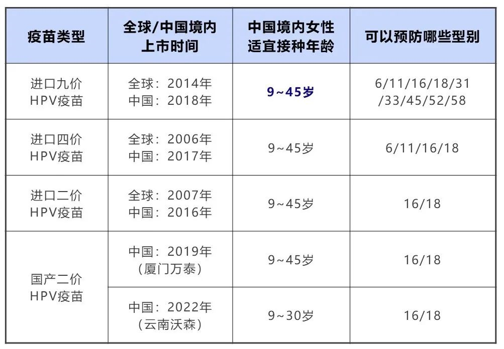 除了本次获批新适应症的九价HPV疫苗,国内可以接种的还有进口四价、进口二价和国产二价HPV疫苗。其中“价”是指可预防的HPV型别数量。