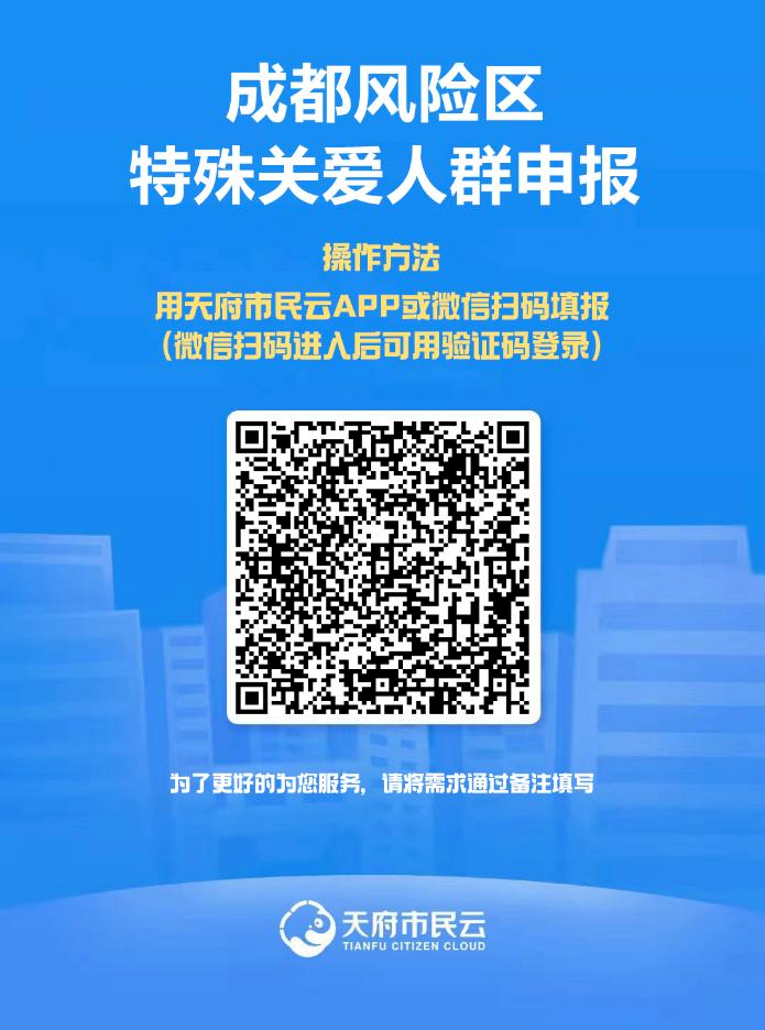 为给风险区特殊关爱人群提供更好的服务和帮助特提供“特殊关爱人群申报码”请相关居民及时扫码申报(或帮助有需求的家人朋友申报)