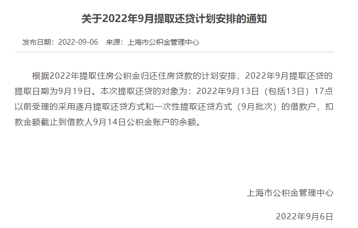 本次提取还贷的对象为:2022年9月13日(包括13日)17点以前受理的采用逐月提取还贷方式和一次性提取还贷方式(9月批次)的借款户,扣款金额截止到借款人9月14日公积金账户的余额。