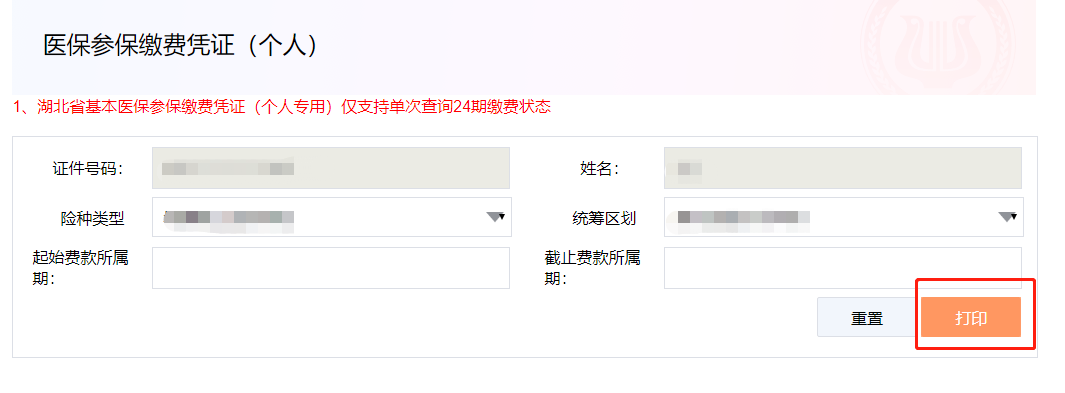 进入“医保参保缴费凭证(个人)”页面后,根据自身实际情况选择险种类型、统筹区、费款所属期(目前只支持查询跨度在24期内的数据),确认后, 点击【打印】,即可下载凭证进行查询打印。