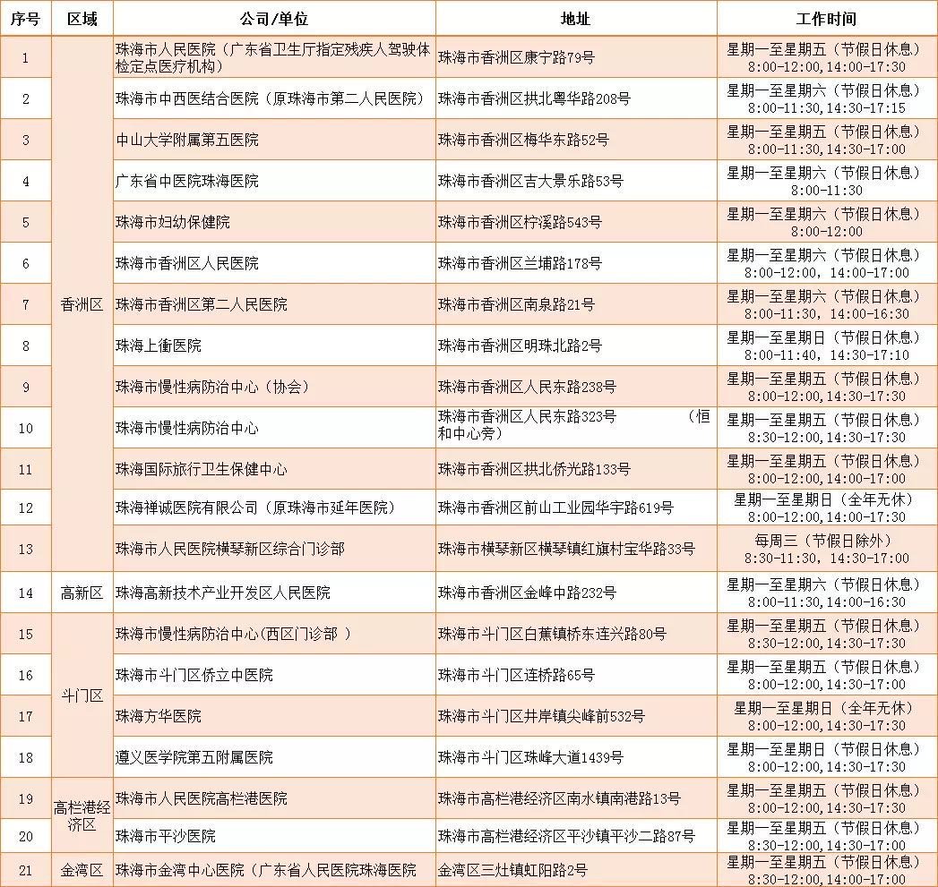 目前,珠海共有21家医疗机构具有驾驶证体检资质,司机朋友可以就近选择医疗机构进行体检,体检时需要带齐身份证、驾驶证和一寸照片。此外,交警部门和医院已建立了信息共享平台,所有体检信息都通过网络信息平台传输,体检后不需要带纸质体检证明来车管所。