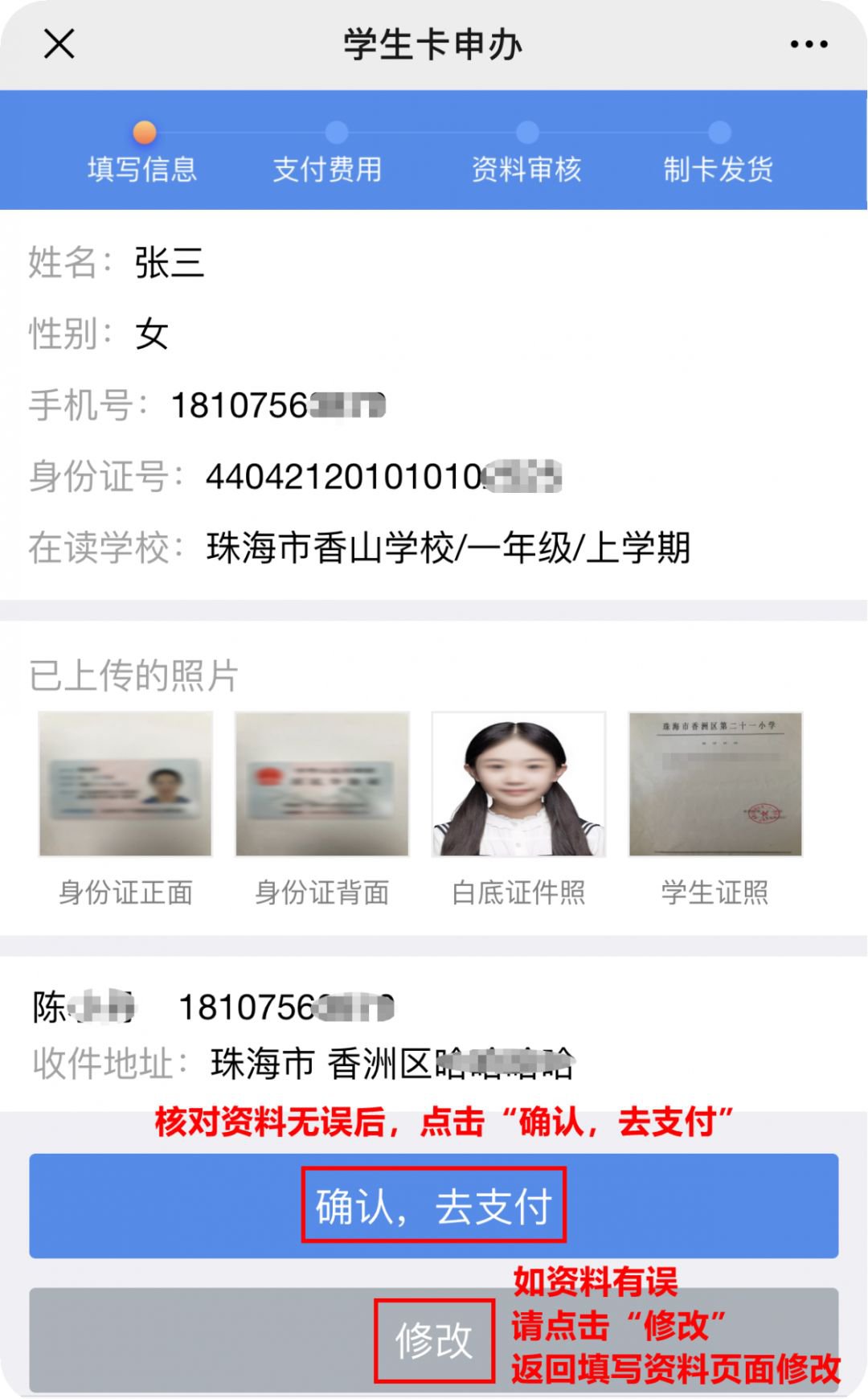 7、二次确认资料无误后,点击“确认,去支付”;如资料有误,请点击“修改”返回资料填写页面修改。