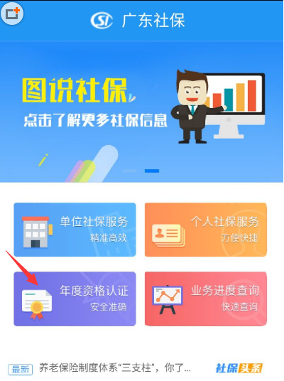 2、受理:打开APP,在社保服务栏目内,点击“个人年度资格认证”按钮,进入服务界面。