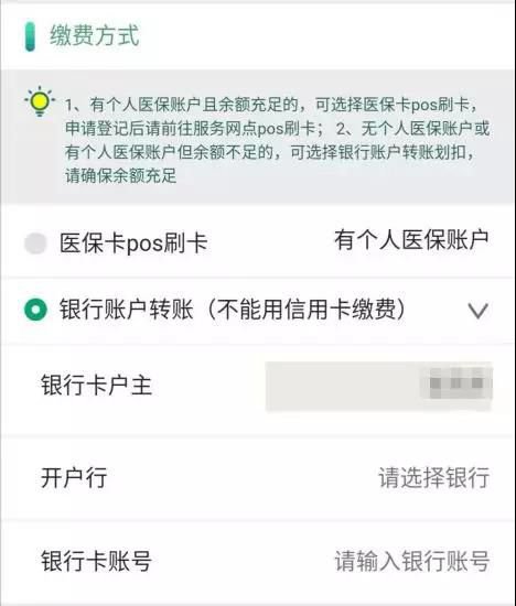 4、选择“银行账户转账”方式,通过本人银行借记卡账户缴纳保费(每人每年190元)。