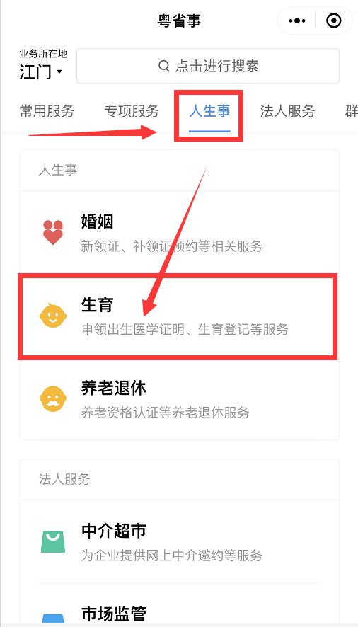 母亲登录粤省事,找到“人生事”,选择“生育”,选择“申领出生医学证明预约”,即可进入。