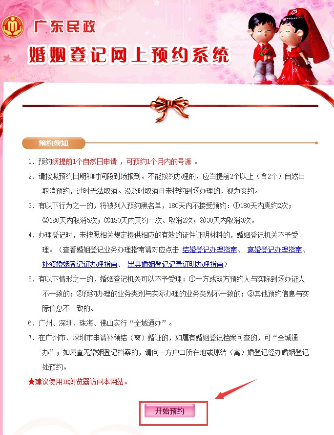 第一步:登录广东省婚姻登记预约系统,阅读预约须知,点击开始预约。