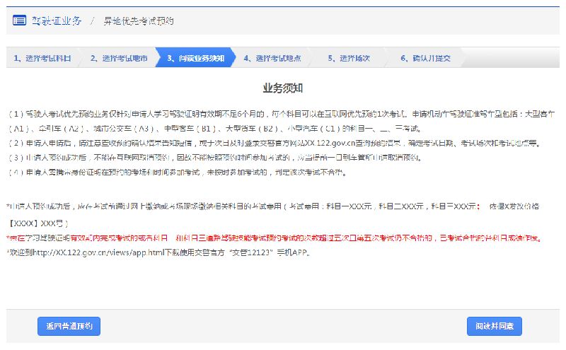 步骤3:【阅读业务须知】返回在该步骤,用户需认真阅读考试预约业务须知,在阅读完毕后,点击【阅读并同意】进入步骤4【选择考试地点】。