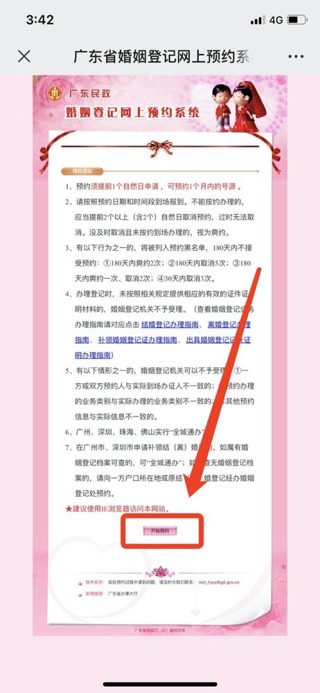 1.点击上方链接进入“广东民政婚姻登记网上预约系统”,点击页面下方粉色“开始预约”。