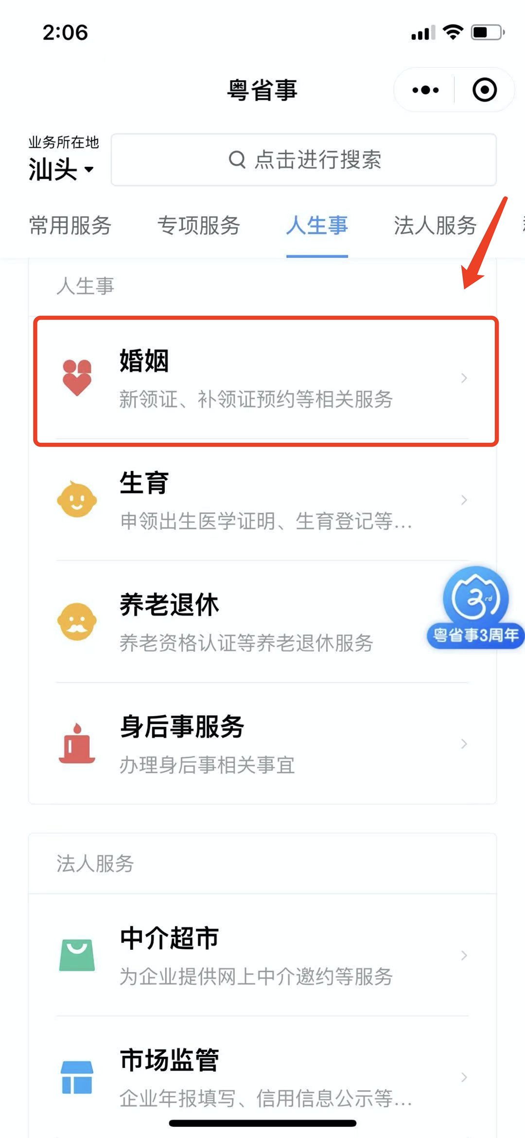 2.登录后下滑点击【人生事】板块,选择【婚姻】进入下一个页面。