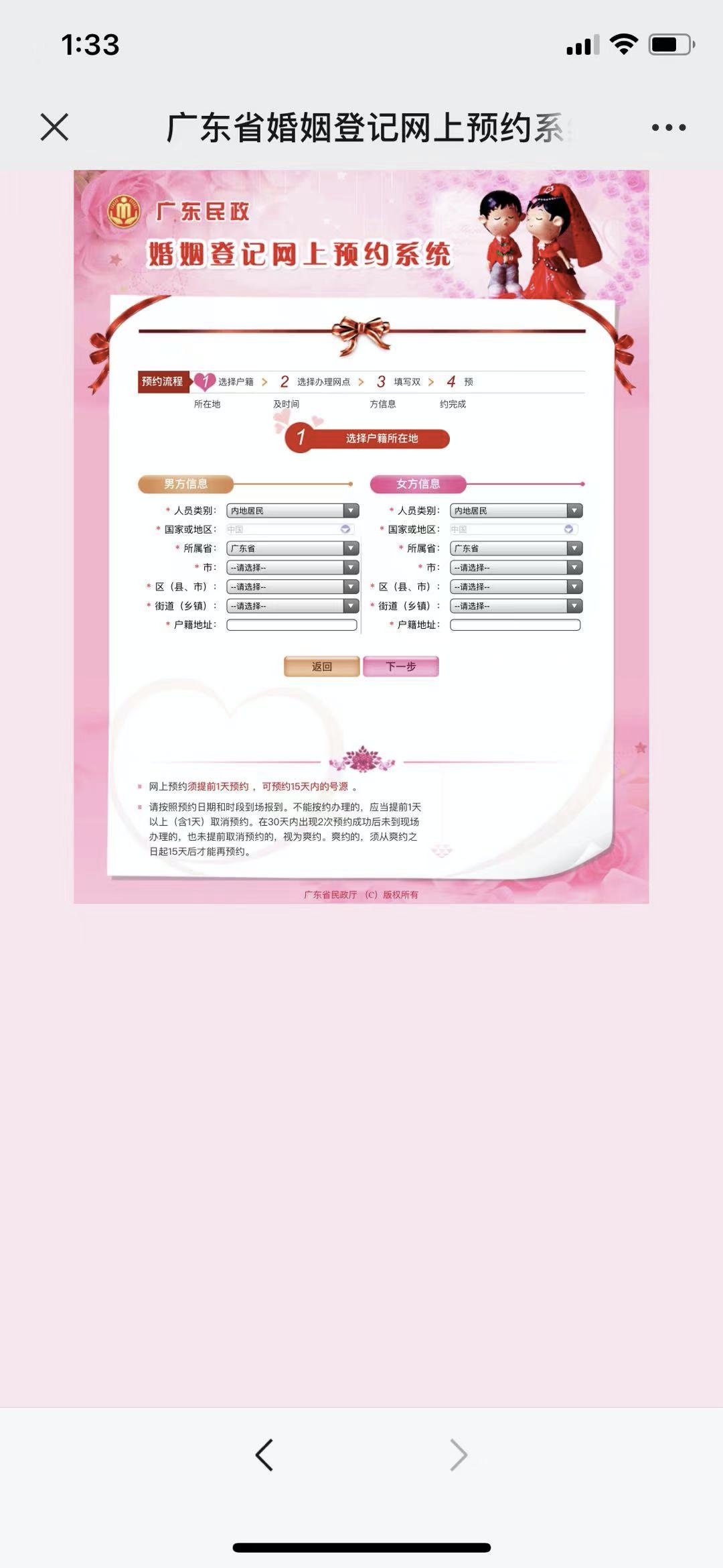 5.进入页面后填写双方个人信息点击【下一步】,根据流程提示选择网点、时间、完善信息即可预约成功。