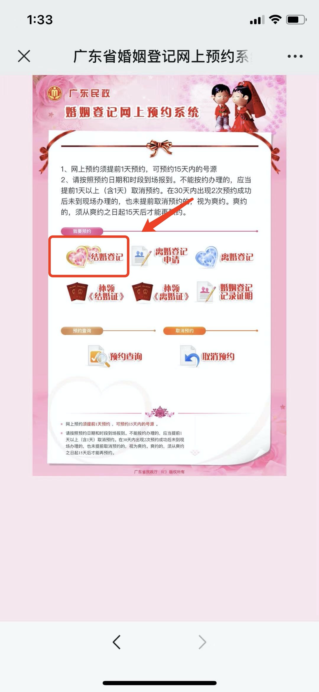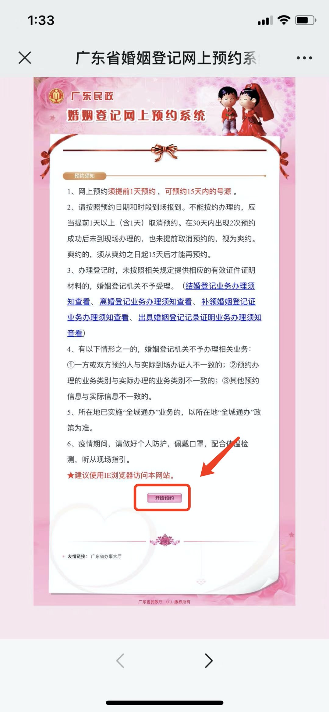 1.进入【广东省婚姻登记网上预约系统】,仔细阅读预约须知,点击下方【开始预约】。