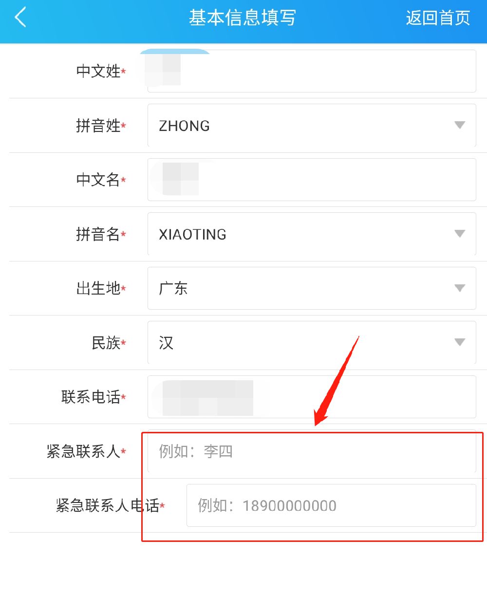 第五步:填写紧急联系人姓名及号码,如下图所示: