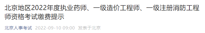 北京地区2022年度执业药师、一级造价工程师、一级注册消防工程师资格考试缴费提示