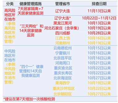 3.辽宁省大连市:11月13日起开展7天居家隔离+7天居家健康监测;10月22日~11月12日执行三天两检+14天居家健康监测,建议在第7天增加一次核酸检测。