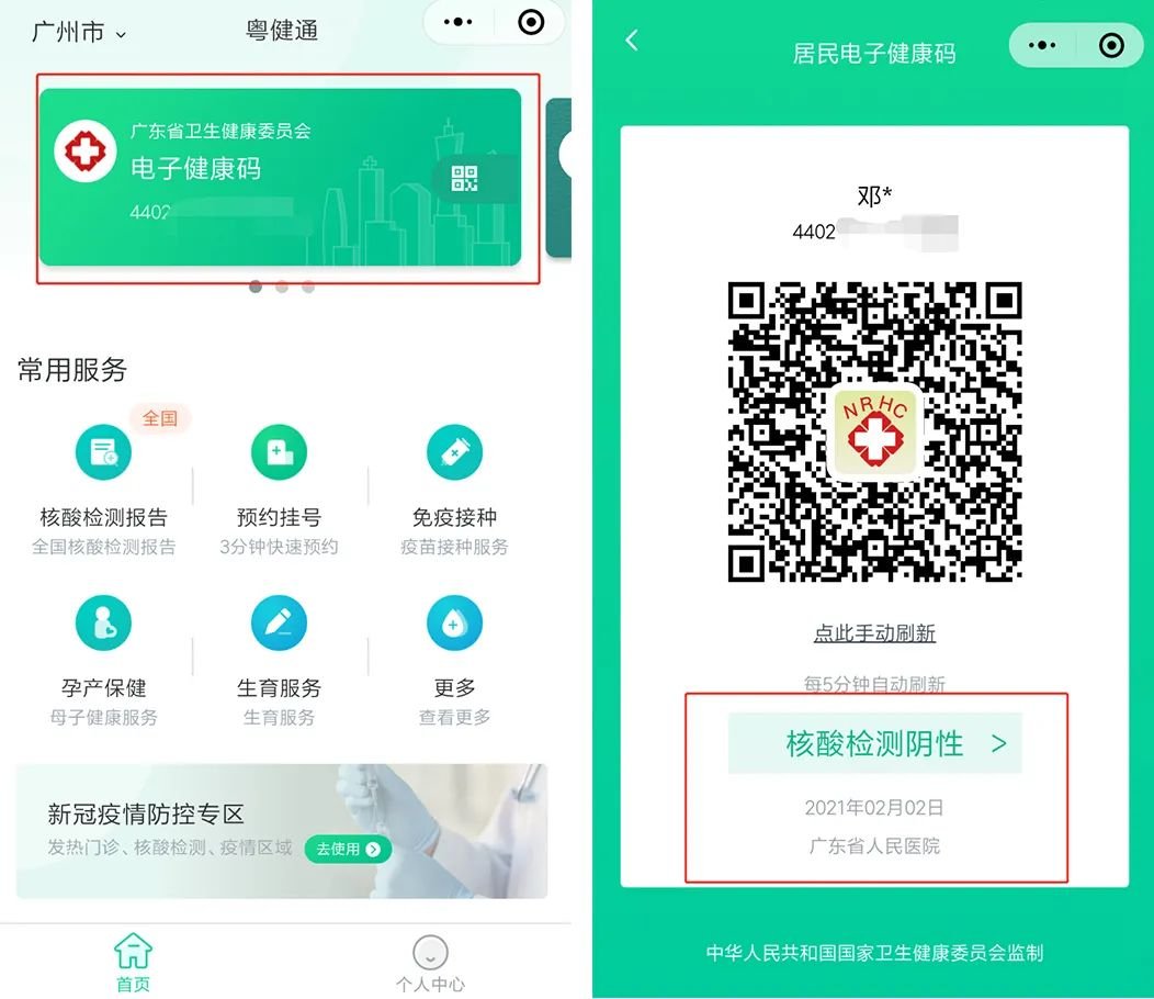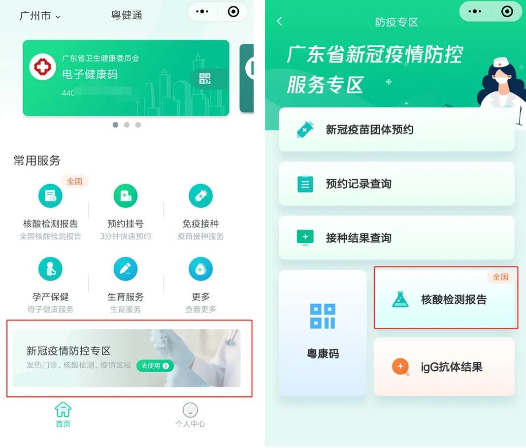关注“粤健通”小程序→领取电子健康码后,从电子健康码查看核酸检测报告。