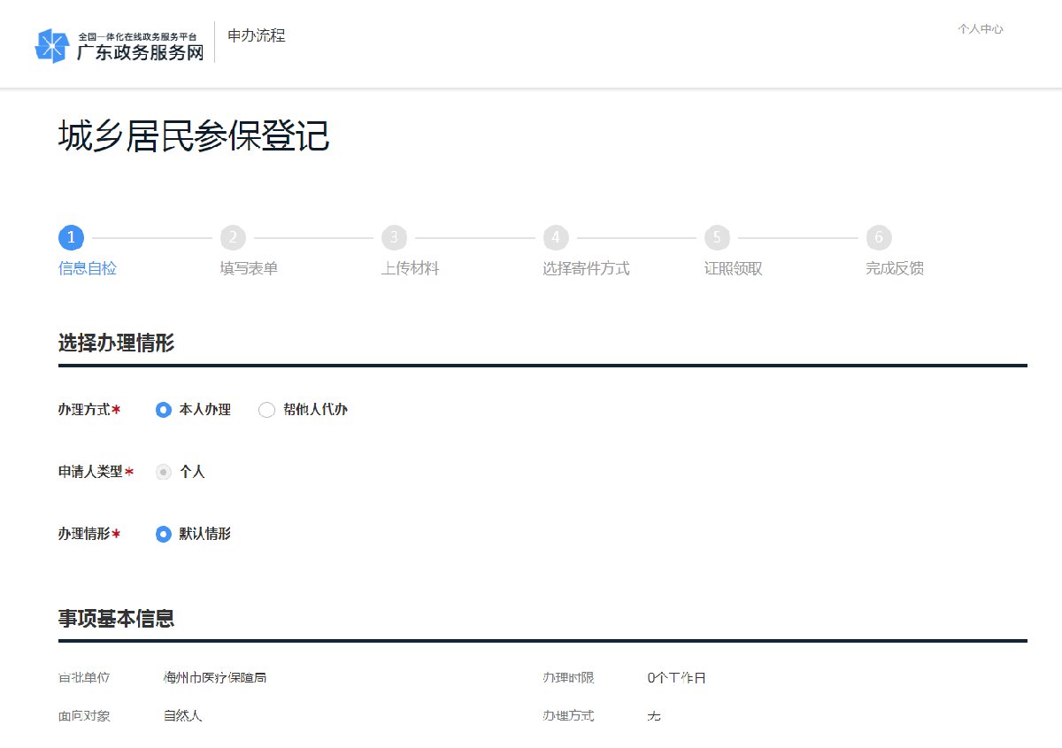 参保人登录“广东政务服务网”进行城乡医保参保登记,参保流程:信息自检——填写表单——上传材料——选择寄件方式——证照领取——完成反馈