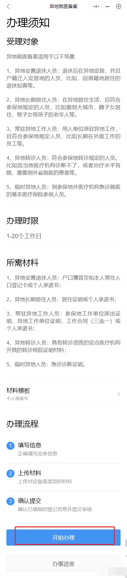 3.点击进入“异地就医备案”界面 → 阅读“办理须知” → “开始办理”。