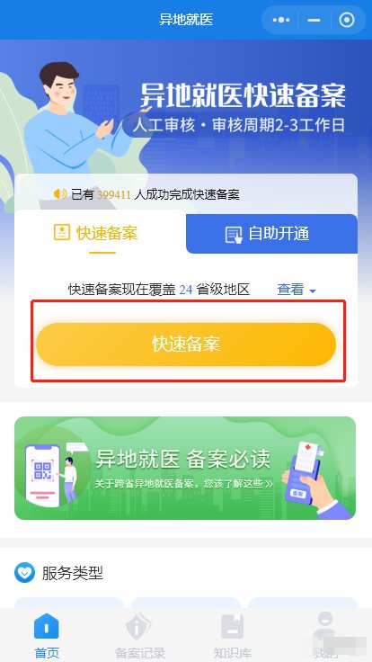 2.打开手机APP或小程序 →“异地就医” → “快速备案”。