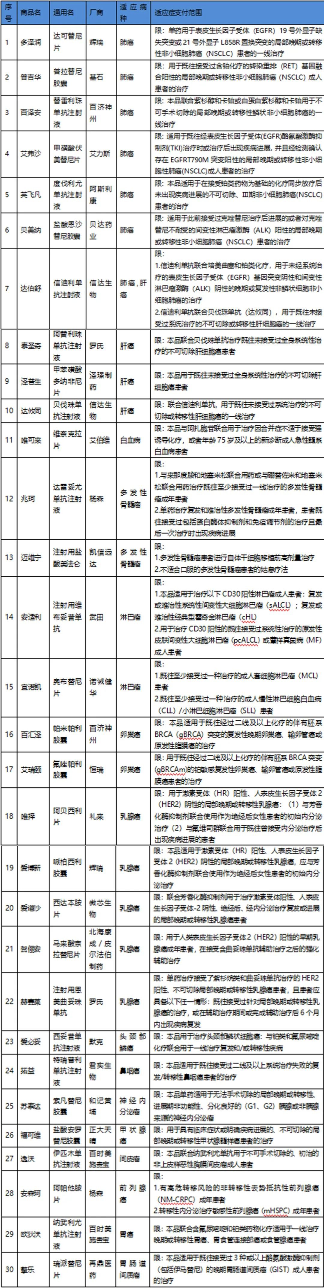 请留意目录内各药品对应的商品名及生产厂家信息,确定您使用的药品的商品名、通用名、支付范围等同时符合上表中的约定。