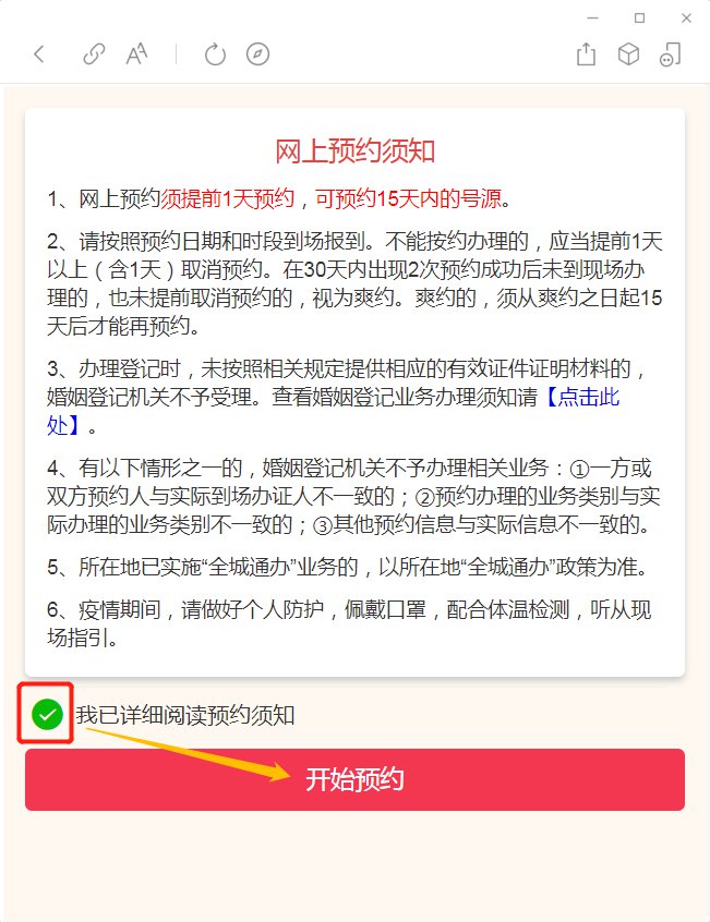 2.阅读网上预约须知后,勾选“我已详细阅读预约须知”,点击“开始预约”。