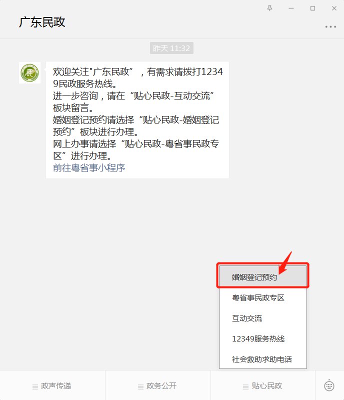1.进入广东民政微信公众号聊天页面(点此进入),点击下方主菜单“贴心民政”——“婚姻登记预约”。