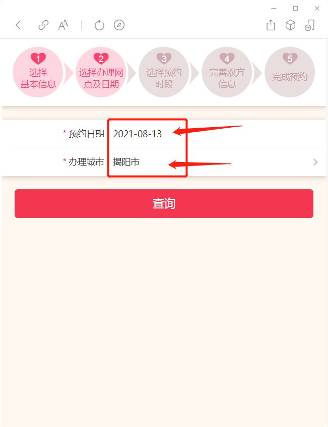5.选择预约日期,办理城市选择揭阳市,点击“查询”。