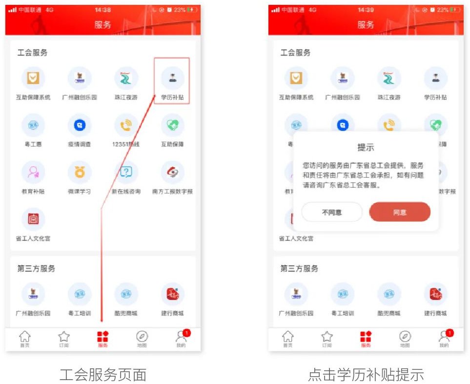 4.进入服务,选择“工会服务”→“学历补贴”,按照流程申请即可。