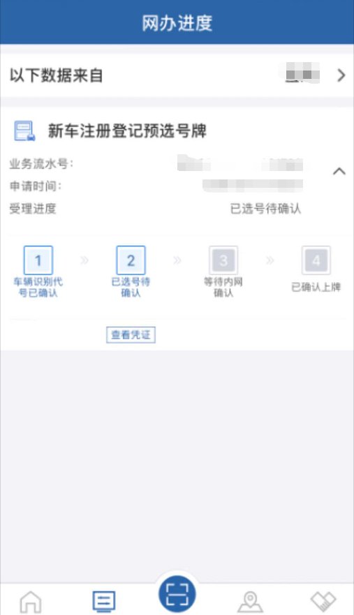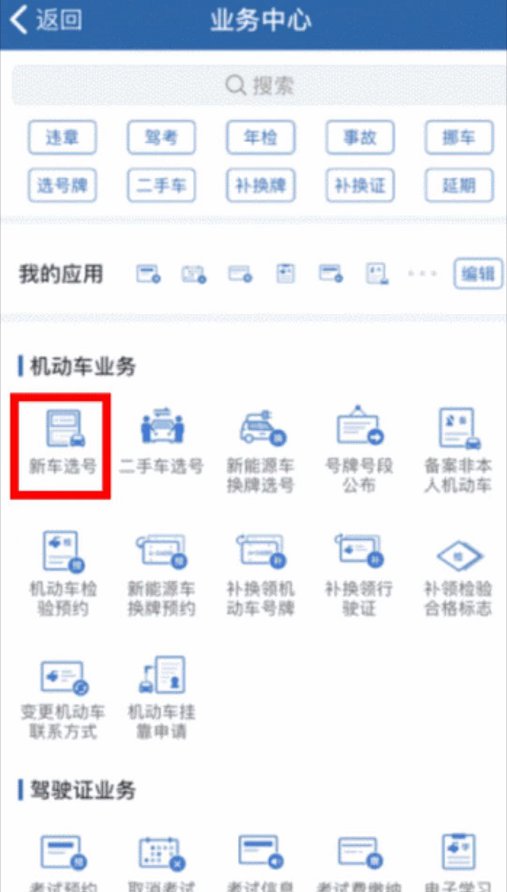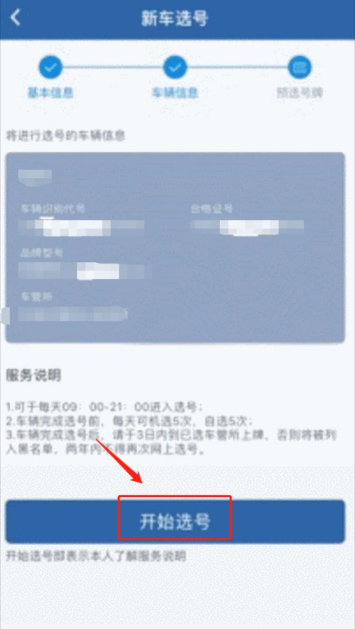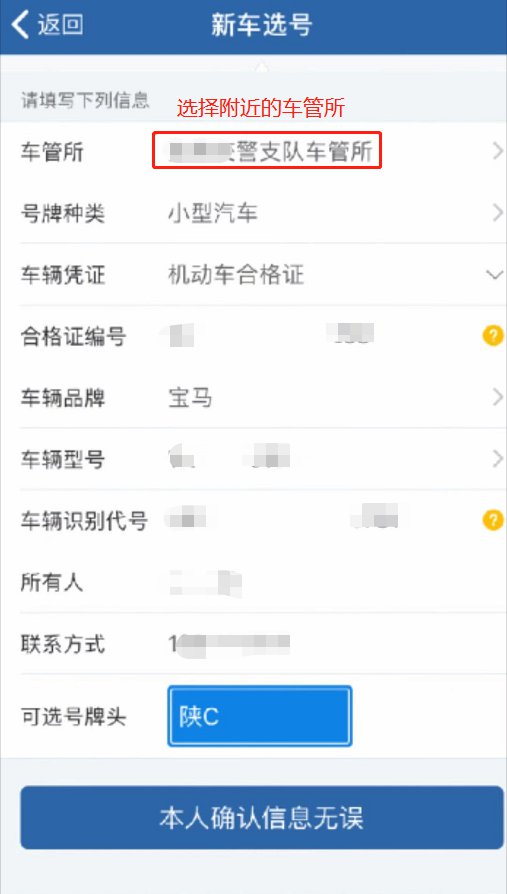登录"交管12123"APP后,通过【业务中心】→【新车选号】,进入新车预选号牌流程,通过该功能可以为本人名下新购小型汽车。选号之前请准备好“机动车合格证书”(或“进口货物证明书”),在预选号牌过程中,您需要录入“车辆识别代号”(也叫车架号)、合格证编号或者进口货物证明编号。