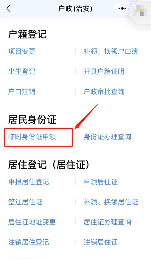 第二步:在户政(治安)页面下滑找到【居民身份证】,点击【 临时身份证】