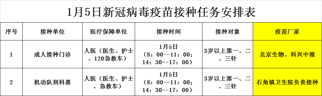 1月5日,佛冈县开放新冠病毒疫苗接种门诊有: