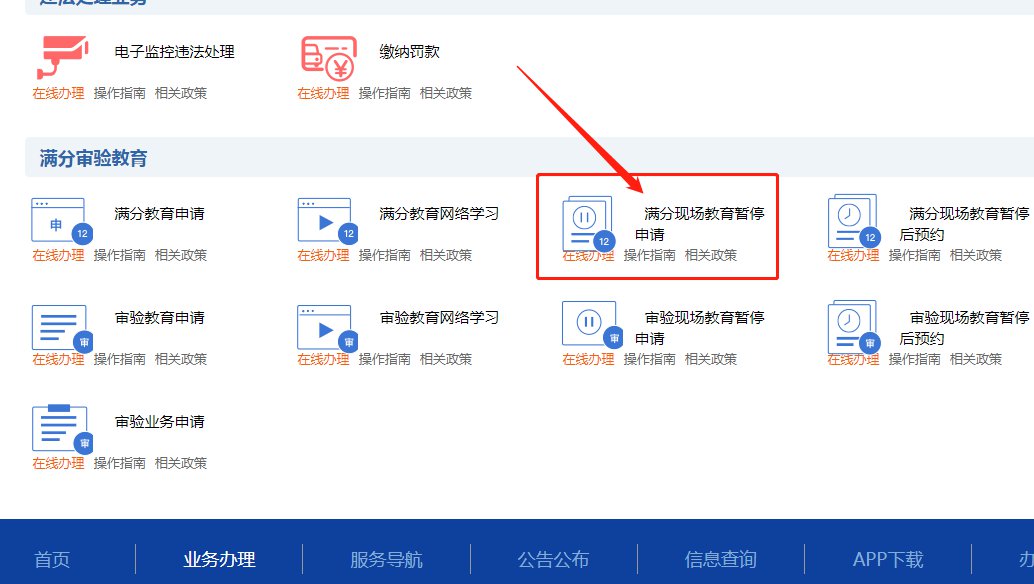 登录交通安全综合服务管理平台,点击【业务办理】→【满分审验业务】→【满分现场教育暂停申请】