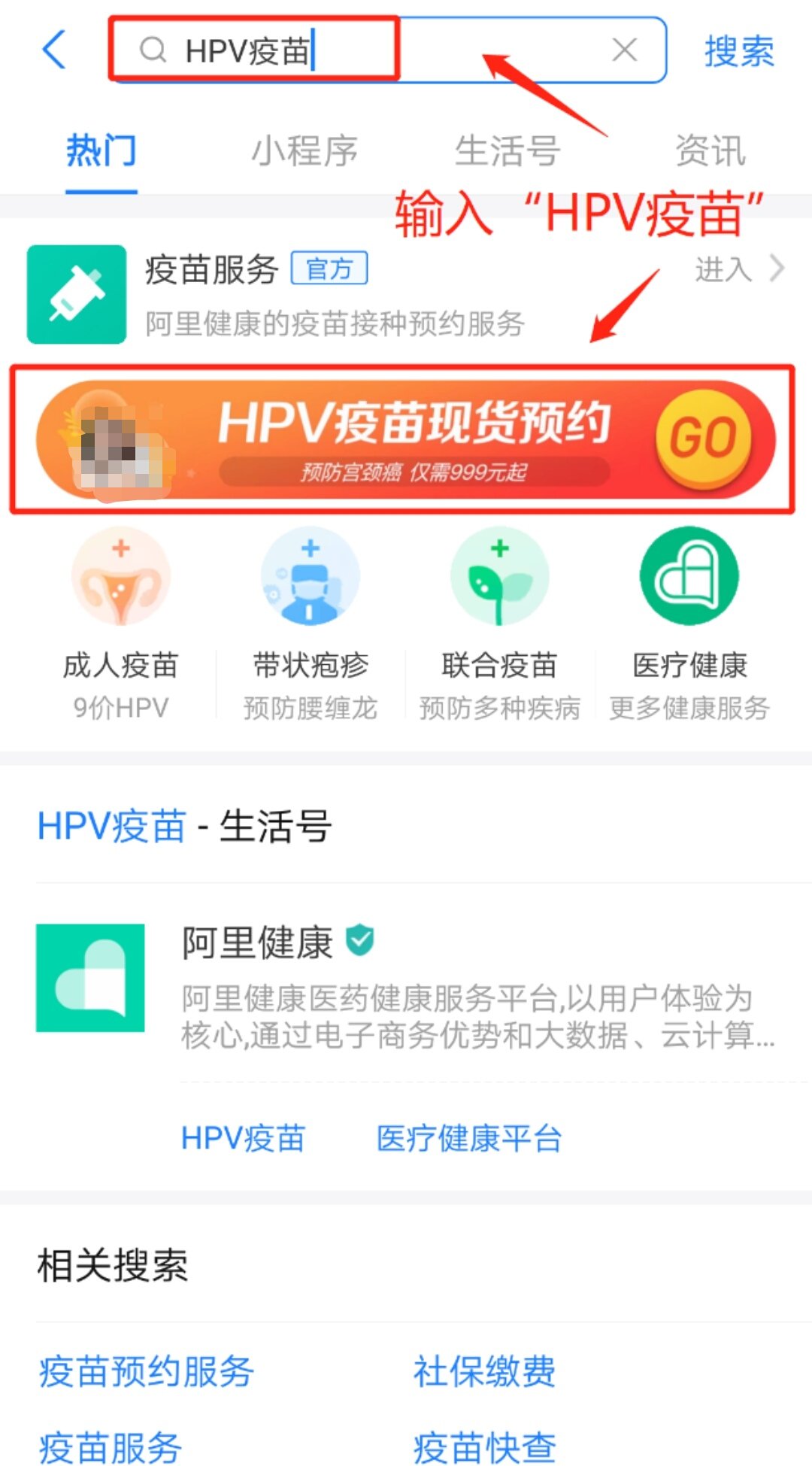 注:可预约九价、四价、二价及国产二价疫苗。1、进入支付宝APP,在搜索栏输入【HPV疫苗】或者【疫苗服务】