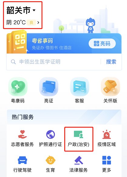 1、进入小程序后,左上角定位在“韶关市”,然后在首页的“热门服务”一栏中选择“户政(治安)”;
