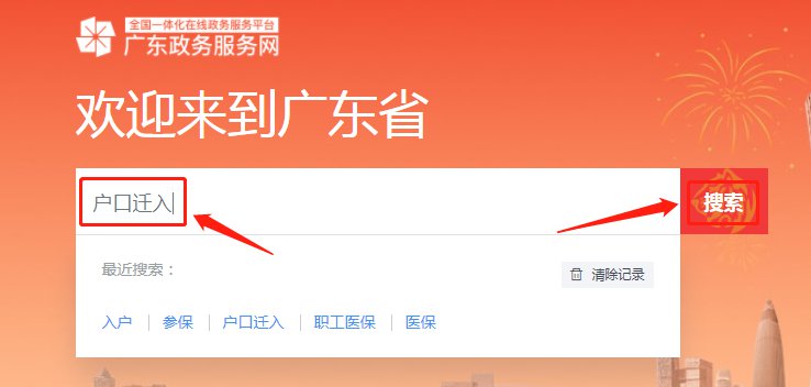 1、进入广东省政务服务网,在对话框输入“户口迁入”,点击“搜索”;