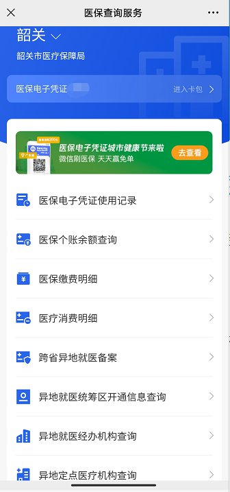 定位在“韶关”后即可进入查询医保缴费、医保个人余额等信息。