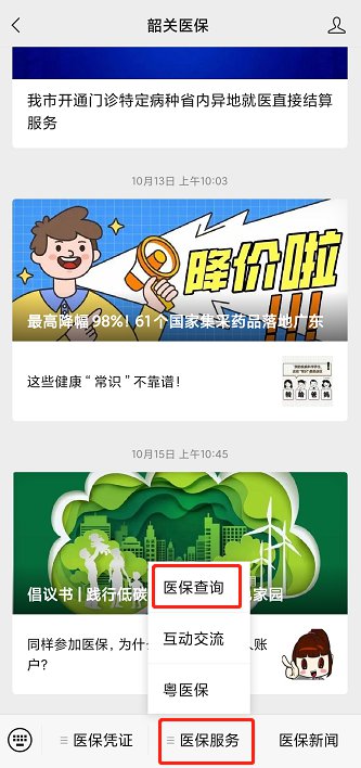 微信搜索并关注“韶关医保”公众号,在菜单栏“医保服务”中选择“医保查询”。