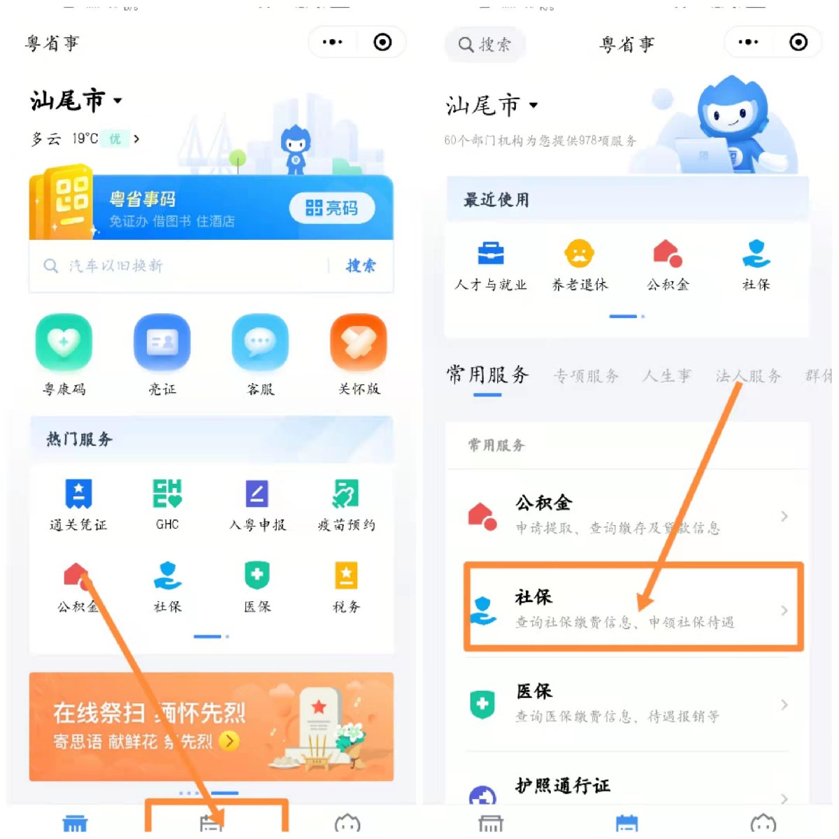 2、登录“粤省事”小程序办理,路径:服务→税务→社会保险费→灵活就业人员社保服务→清缴社保费。
