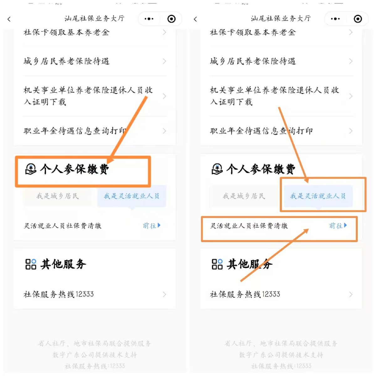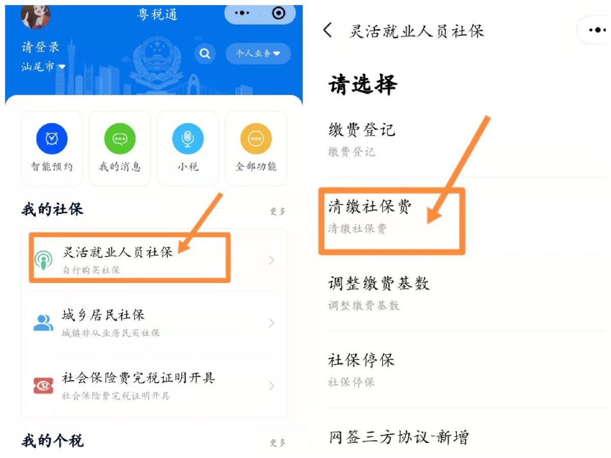 1、登录“粤税通”小程序办理,路径:我的社保→灵活就业人员社保→清缴社保费;