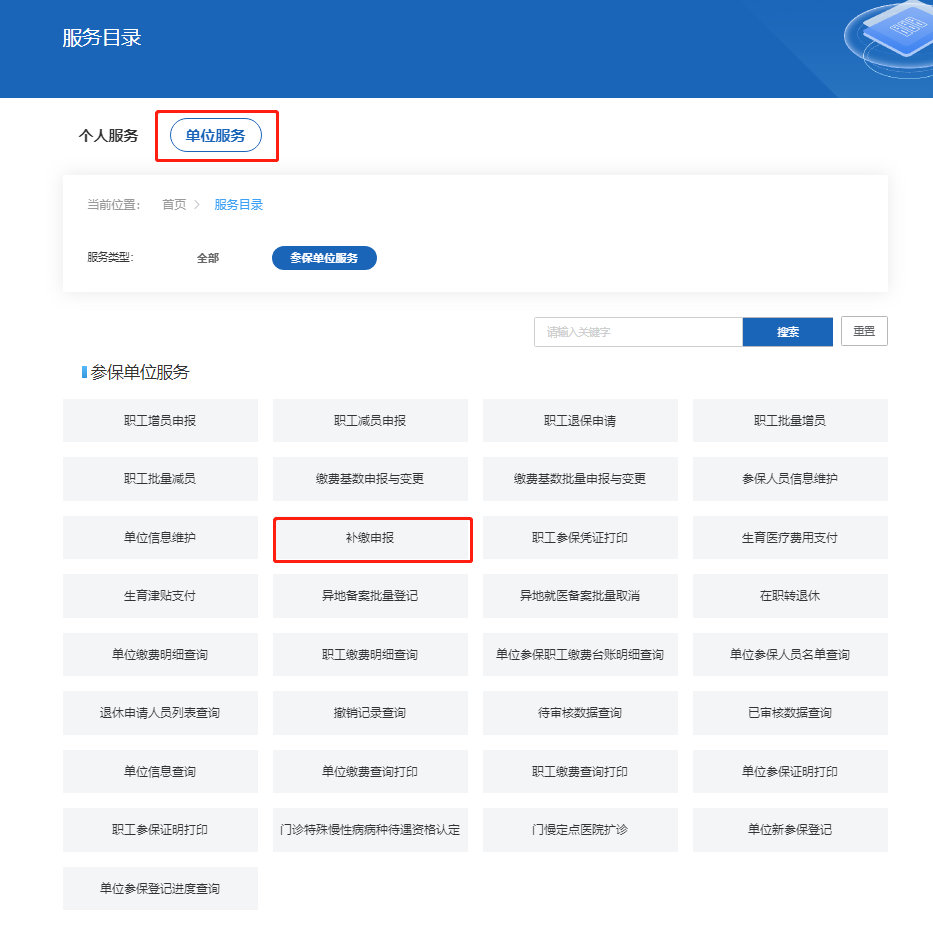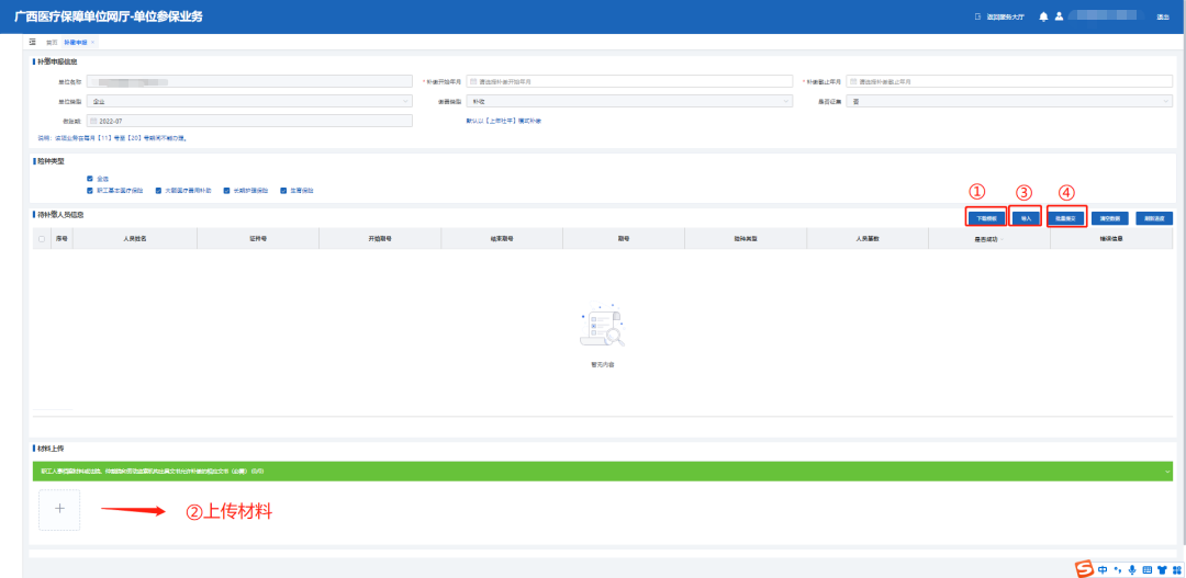 登录广西医疗保障网上服务大厅›››点击“服务目录”›››选择“单位服务”下的“补缴申报”›››录入带*的必录项›››点击“下载模板”添加录入需补缴人员信息;上传所需材料;点击“导入”;再点击“批量提交”即可。