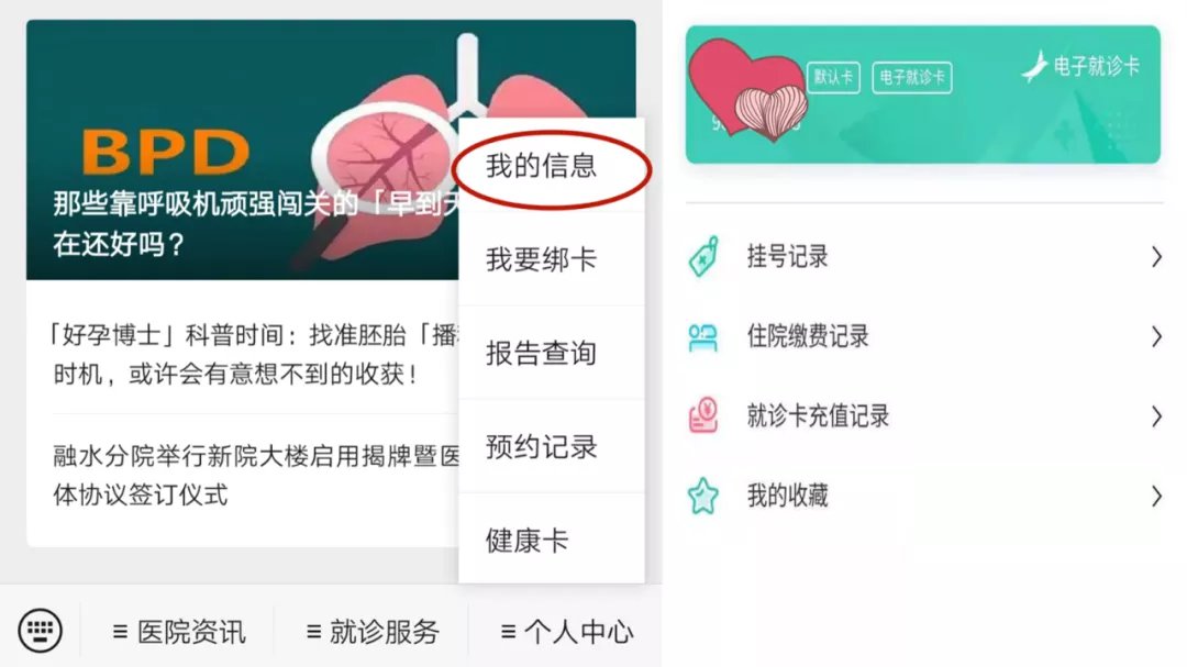 4.进入“个人中心”,核对个人信息,到护士站取号等候。