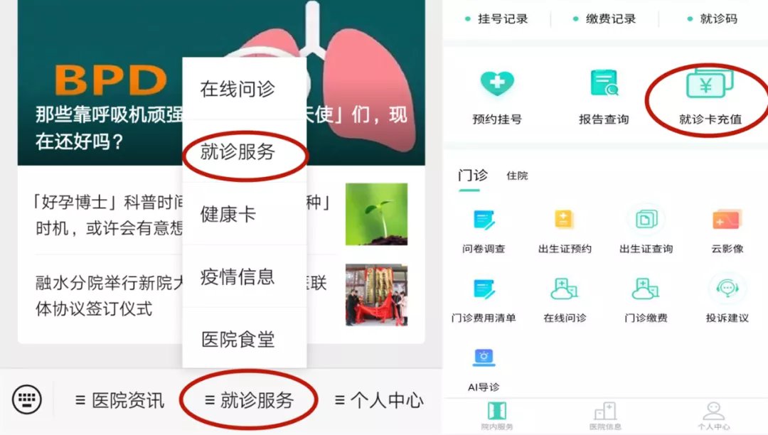 3.缴费充值:进入“就诊服务”,进行就诊卡充值(也可自行到四号楼1楼门诊收费处缴费)。