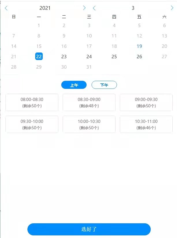 第五步:选择有剩余号源的接种日期和接种时段,并完成预约。