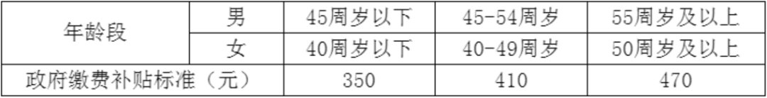 政府对参保人员缴费给予补贴,补贴标准根据参保人员所属年龄段(以缴费当年12月31日本人周岁年龄为准)设定,见下表: