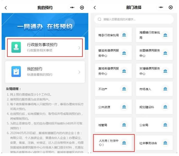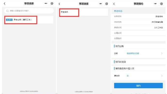 03、选择“行政服务事项预约”,部门选择“人社局(社保中心)”,选择“养老业务(建筑工伤)”—“养老综合”事项,选择预约日期进行预约。