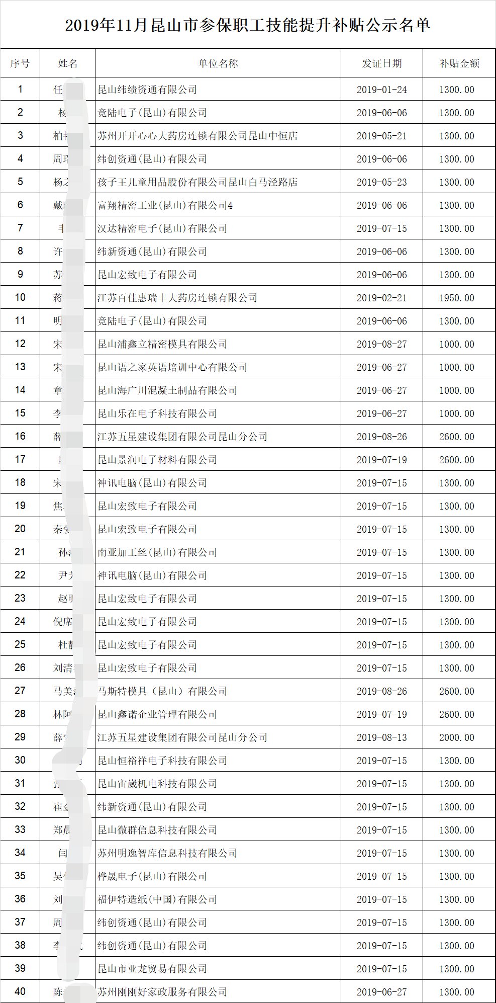 根据《关于失业保险支持参保职工提升职业技能有关问题的通知》(昆人社就〔2018〕4号)规定,现将2019年11月昆山市参保职工技能提升补贴名单进行公示,公示期为2019年12月04日至12月10日(共5个工作日),如有异议,请拨打57592089反馈。