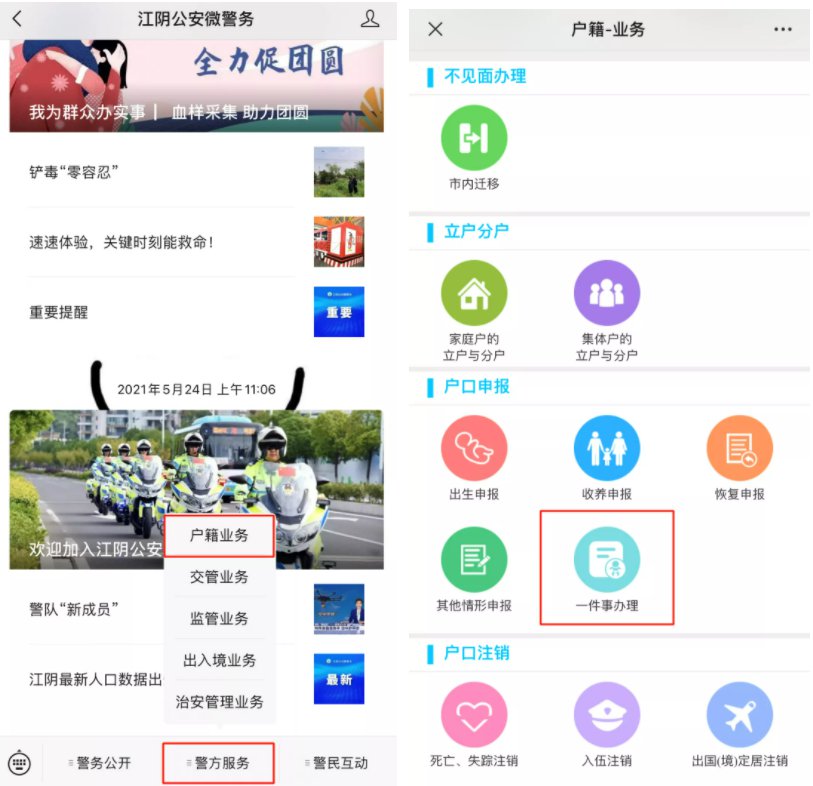 市民可通过“江阴公安微警务”、“江苏政府服务APP”、“最江阴APP”进入“一件事”服务专区,点击需要办理的服务事项。