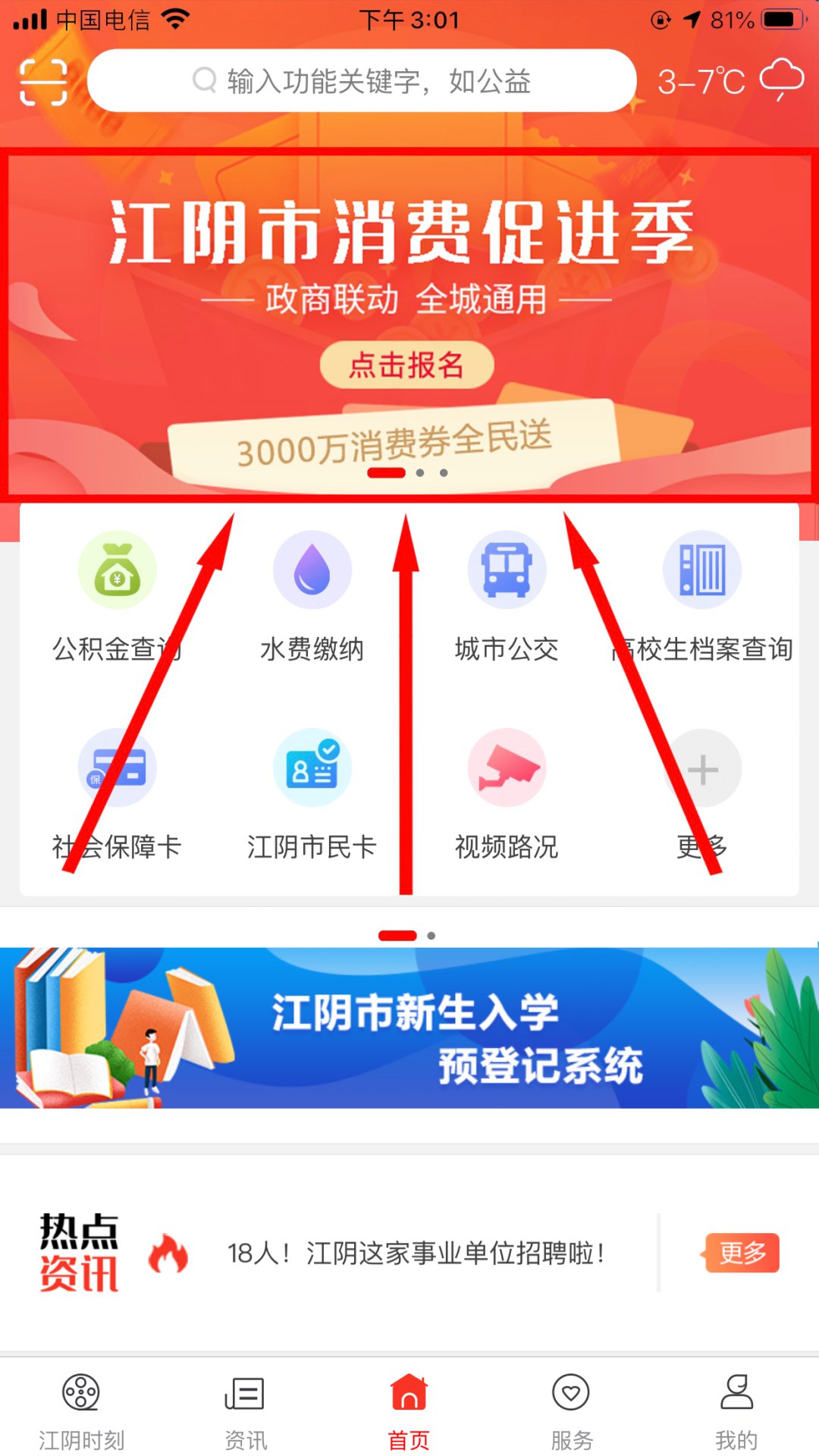 1.下载、注册“最江阴”APP,点击首页顶部图片进入“江阴市消费促进季”平台;