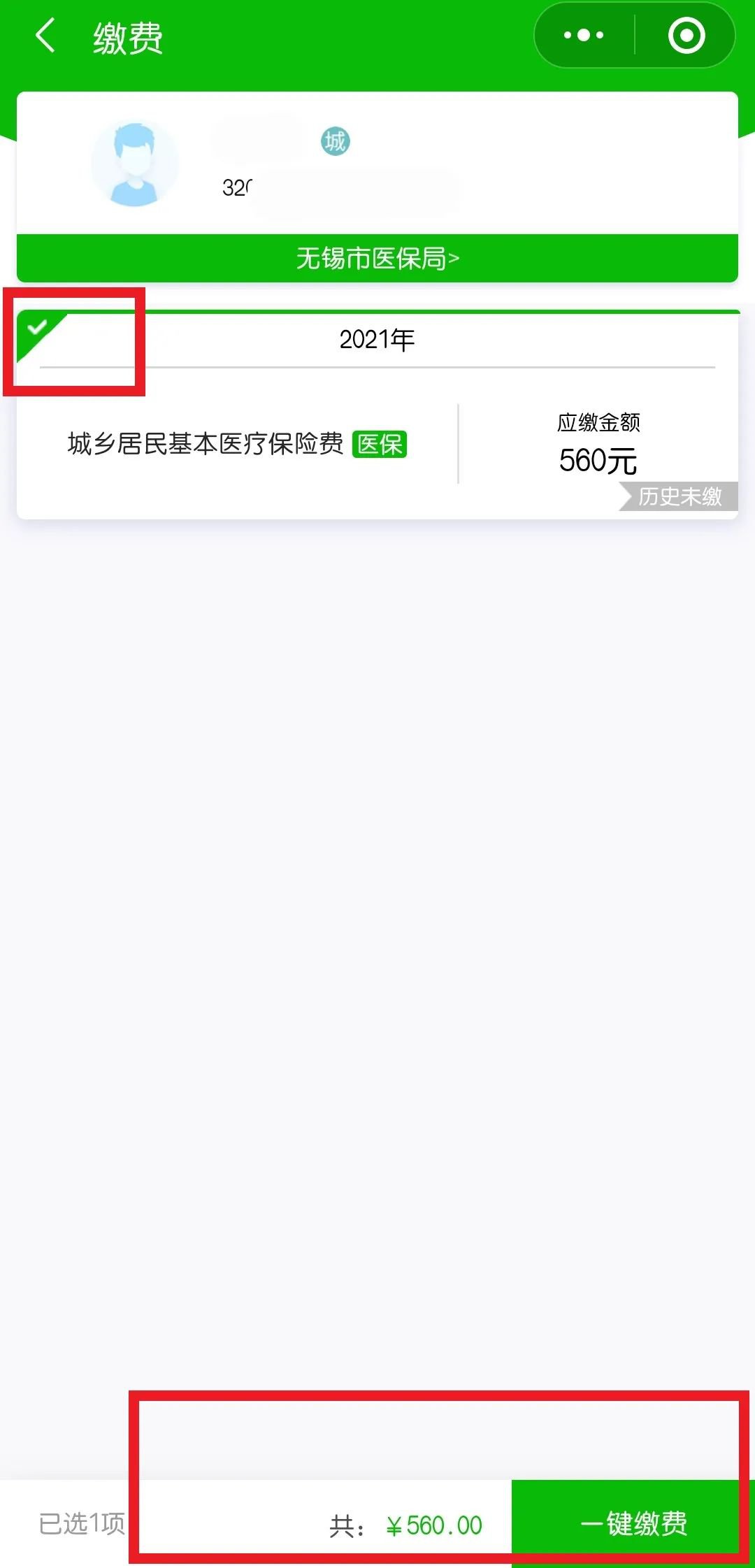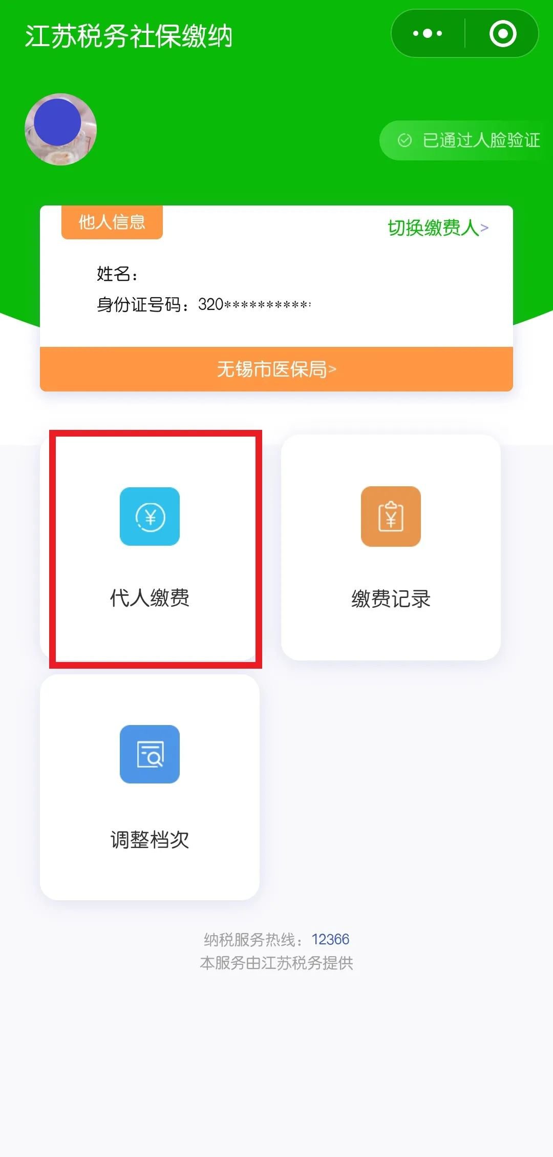 3.选中需缴费人员后,点击查询参保及应缴信息,选择对应的经办机构(城乡居民基本医疗保险对应的经办机构为无锡市医保局)。点击【代人缴费】查询出档次信息及待缴费数据,确认待缴数据,勾选并点击【一键缴费】,支付成功即完成缴费。