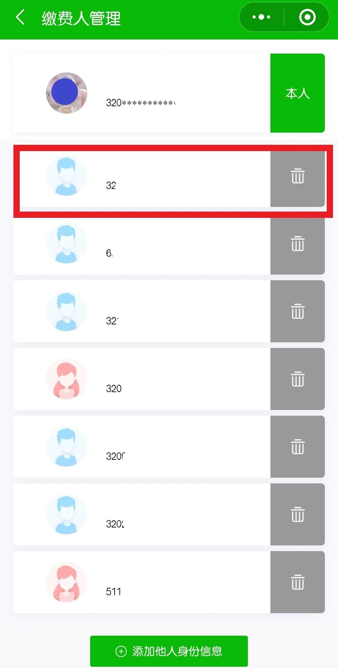 2.输入姓名、手机号、身份证号进行实名认证,并选择为本人或他人缴费。为本人缴费可直接点击【缴费】;为他人缴费可点击右上角【切换缴费人】→【添加他人身份信息】,并完善证件类型、缴费人姓名、证件号码,然后点击【确认】。