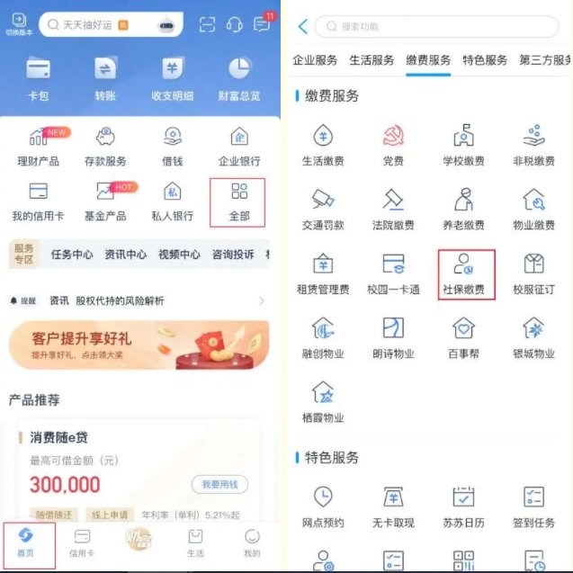 1.打开江苏银行手机银行,选择【缴费服务】→【社保缴费】。